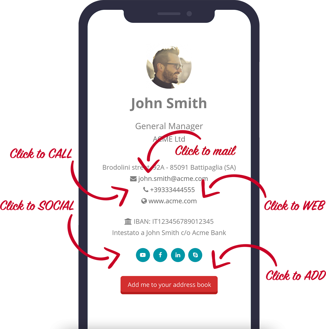 Il destinatario potrà interagire con i tuoi dati e con un click potrà chiamarti, scriverti, visitare il tuo profilo social o aggiungerti alla sua rubrica.
